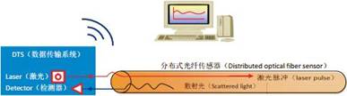 光纖測(cè)溫系統(tǒng)是基于光波散射技術(shù)的傳感監(jiān)測(cè)系統(tǒng),光纖既作為檢測(cè)單元又作為傳輸單元。利用光纖將待測(cè)對(duì)光纖內(nèi)傳輸?shù)墓獠▍⒘窟M(jìn)行調(diào)制,并對(duì)被調(diào)制過的光波信號(hào)進(jìn)行解調(diào)檢測(cè),從而獲得待測(cè)量。原理圖如下:
